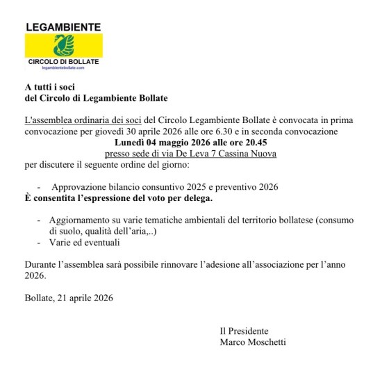 A tutti i socidel Circolo di Legambiente BollateL’assemblea ordinaria dei soci del Circolo Legambiente Bollate è convocata in primaconvocazione per…