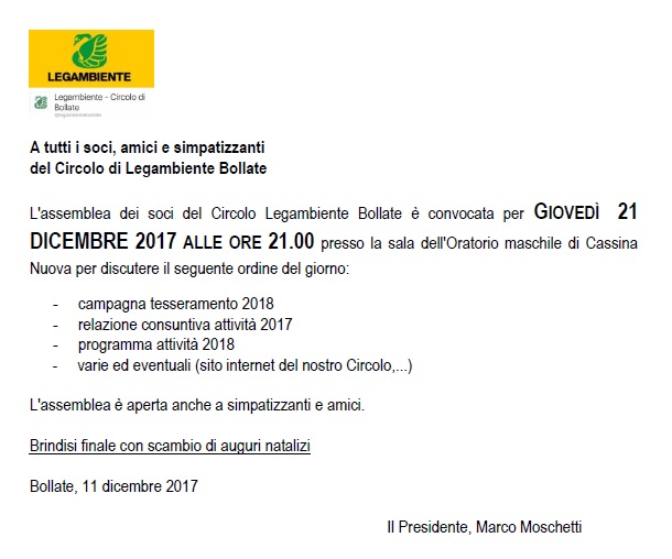 L’assemblea dei soci del Circolo Legambiente Bollate è convocata per Giovedì 21 DICEMBRE 2017 alle ore 21.00 presso la sala dell’Oratorio maschile di Cassina Nuova per discutere il seguente ordine del giorno: