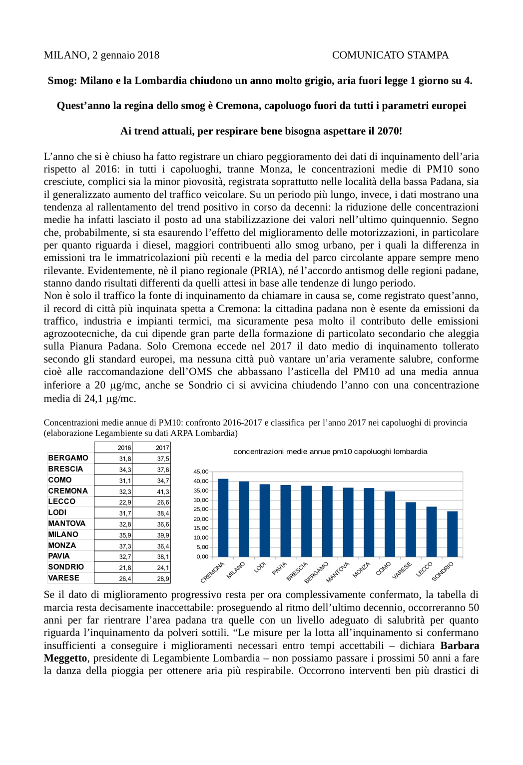 Non è solo il traffico la fonte di inquinamento da chiamare in causa se, come registrato quest’anno, il record di città più inquinata spetta a Cremona: la cittadina padana non è esente da emissioni da traffico, industria e impianti termici, ma sicuramente pesa molto il contributo delle emissioni agrozootecniche, da cui dipende gran parte della formazione di particolato secondario che aleggia sulla Pianura Padana. Solo Cremona eccede nel 2017 il dato medio di inquinamento tollerato secondo gli standard europei, ma nessuna città può vantare un’aria veramente salubre, conforme cioè alle raccomandazione dell’OMS che abbassano l’asticella del PM10 ad una media annua inferiore a 20 mg/mc, anche se Sondrio ci si avvicina chiudendo l’anno con una concentrazione media di 24,1 mg/mc.