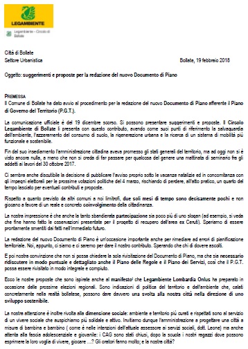 Il circolo bollatese di Legambiente ha inviato i propri suggerimenti e le proprie proposte per quanto in oggetto in data di ieri. 19 febbraio 2018. A seguire il testo spedito