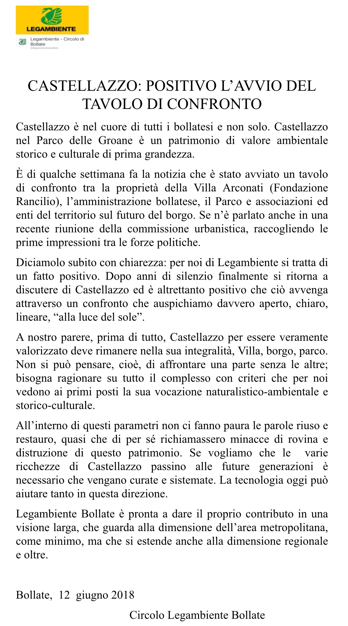 Diciamolo subito con chiarezza: per noi di Legambiente si tratta di un fatto positivo. Dopo anni di silenzio finalmente si ritorna a discutere di Castellazzo ed è altrettanto positivo che ciò avvenga attraverso un confronto che auspichiamo davvero aperto, chiaro, lineare, “alla luce del sole”.