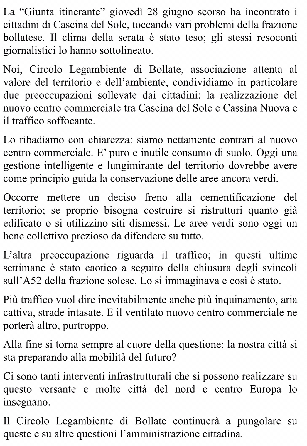 Noi, Circolo Legambiente di Bollate, associazione attenta al valore del territorio e dell’ambiente, condividiamo in particolare due preoccupazioni sollevate dai cittadini: la realizzazione del nuovo centro commerciale tra Cascina del Sole e Cassina Nuova e il traffico soffocante.