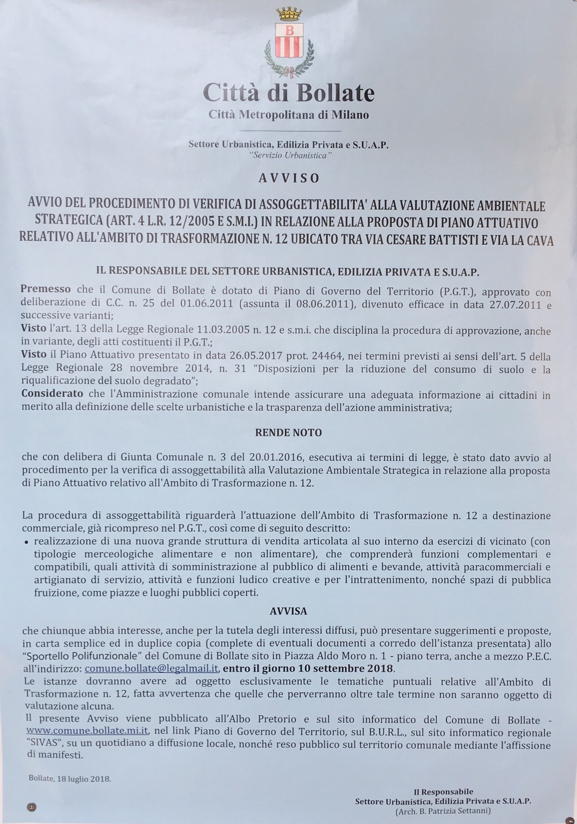 oggetto: PROCEDIMENTO DI VERIFICA DI ASSOGGETTABILITA’ ALLA VALUTAZIONE AMBIENTALE STRATEGICA (ART. 4 L.R. 12/2005 E S.M.I.) IN RELAZIONE ALLA PROPOSTA DI PIANO ATTUATIVO RELATIVO ALL’AMBITO DI TRASFORMAZIONE N. 12, UBICATO TRA VIA CESARE BATTISTI E VIA LA CAVA.