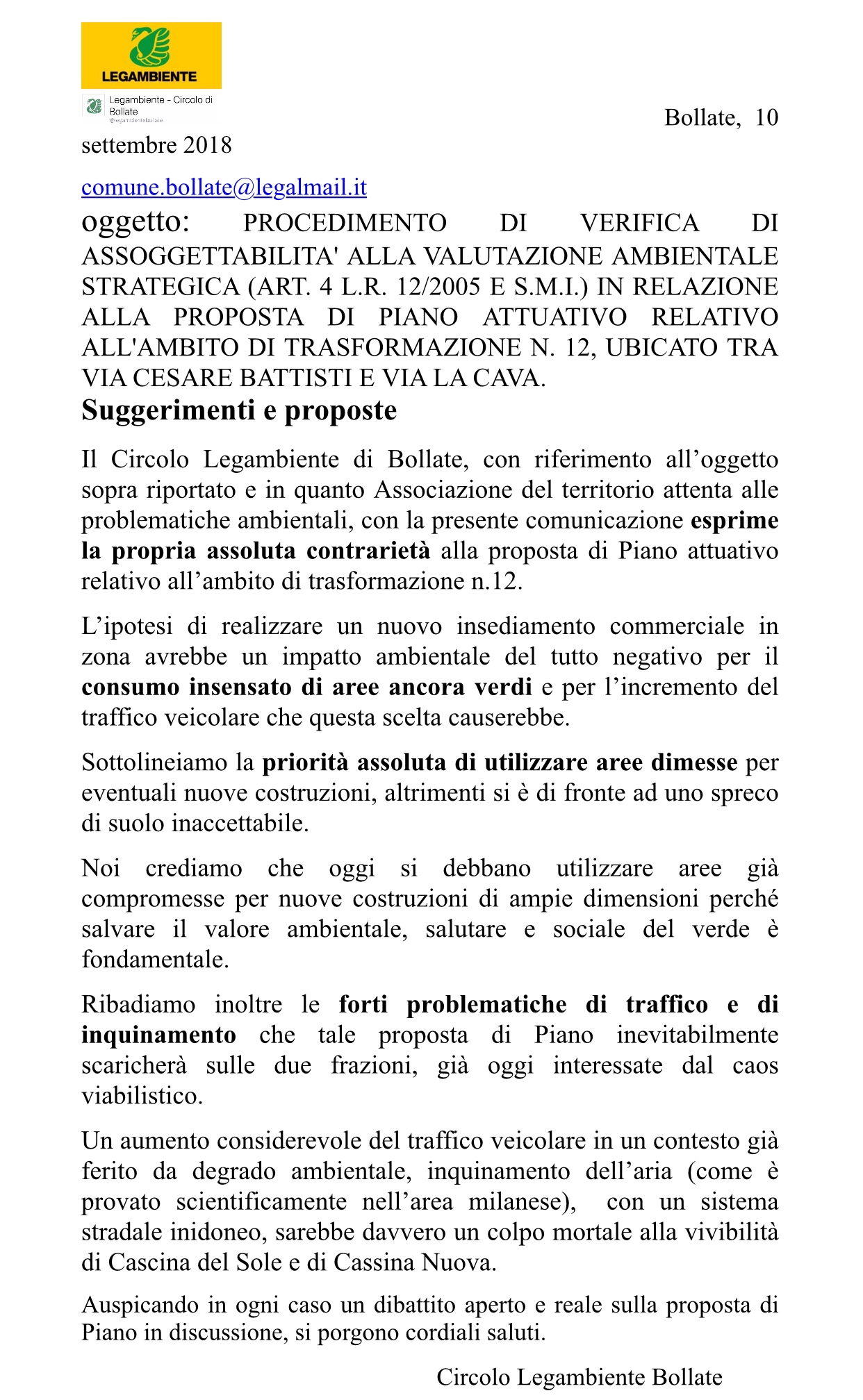 Il Circolo Legambiente di Bollate, con riferimento all’oggetto sopra riportato e in quanto Associazione del territorio attenta alle problematiche ambientali, con la presente comunicazione esprime la propria assoluta contrarietà alla proposta di Piano attuativo relativo all’ambito di trasformazione n.12.