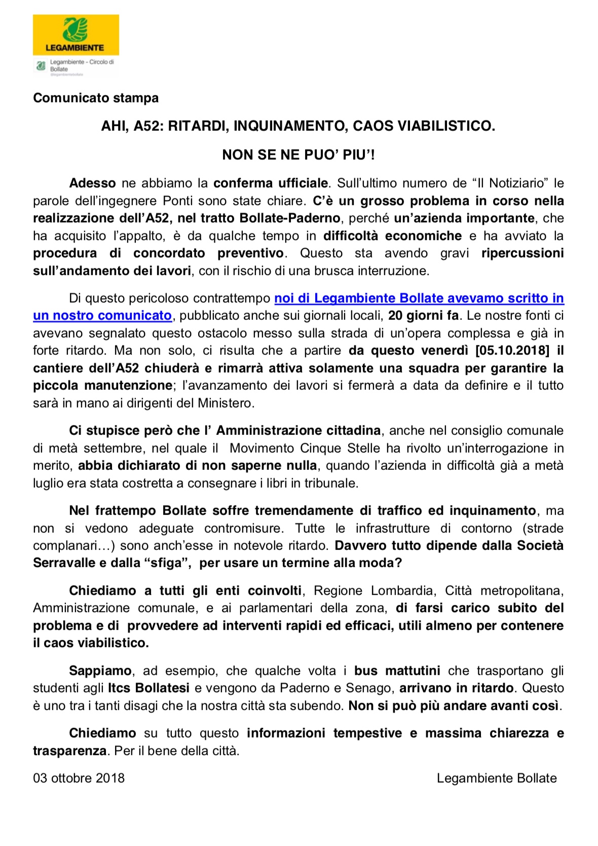 Di questo pericoloso contrattempo noi di Legambiente Bollate avevamo scritto in un nostro comunicato, pubblicato anche sui giornali locali, 20 giorni fa. Le nostre fonti ci avevano segnalato questo ostacolo messo sulla strada di un’opera complessa e già in forte ritardo. Ma non solo, ci risulta che a partire da questo venerdì [05.10.2018] il cantiere dell’A52 chiuderà e rimarrà attiva solamente una squadra per garantire la piccola manutenzione; l’avanzamento dei lavori si fermerà a data da definire e il tutto sarà in mano ai dirigenti del Ministero.