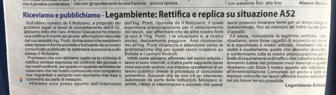 Sull’ultimo numero de Il Notiziario, a proposito dei problemi legati ai lavori di completamento dell’A 52, abbiamo letto che l’avv. Antonio Giacalone ha chiesto una rettifica in merito ad alcune affermazioni rilasciate dal suo assistito ing. Ponti, dichiarazioni che sarebbero state riprese in forma scorretta e fuorviante da un nostro comunicato pubblicato la settimana successiva sullo stesso Il Notiziario.