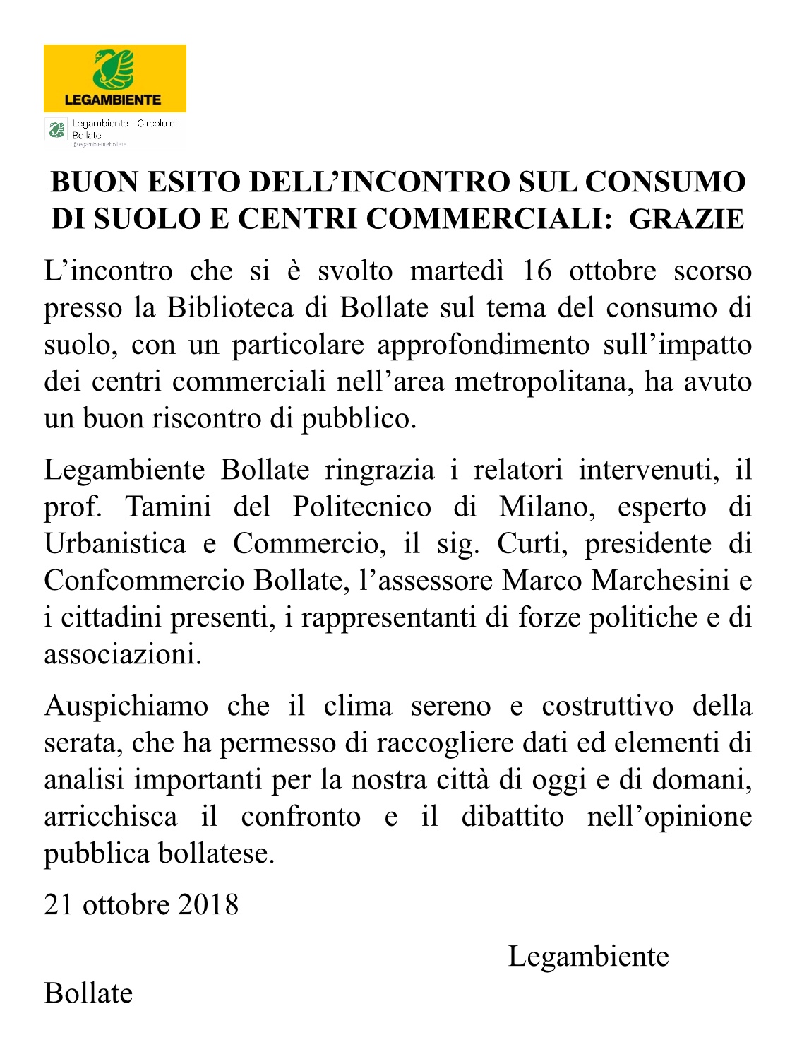 Legambiente Bollate ringrazia i relatori intervenuti, il prof. Tamini del Politecnico di Milano, esperto di Urbanistica e Commercio, il sig. Curti, presidente di Confcommercio Bollate, l’assessore Marco Marchesini e i cittadini presenti, i rappresentanti di forze politiche e di associazioni.