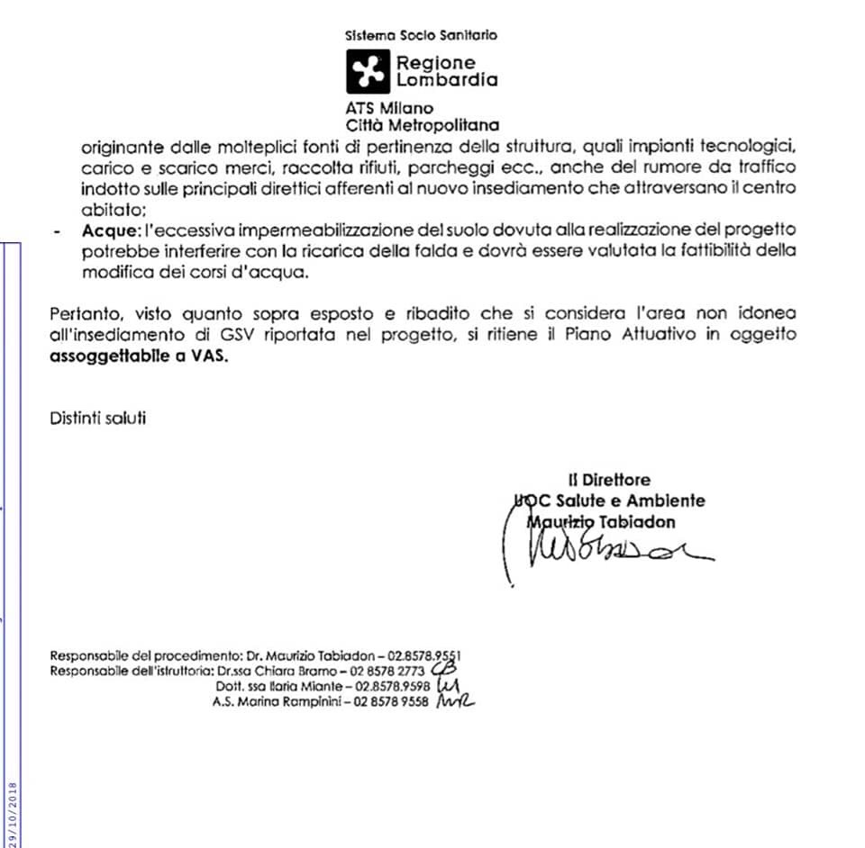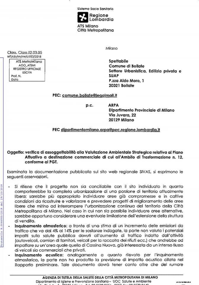 Mentre a Paderno c’è chi guarda già avanti nel tempo, a Bollate si va a tutto gas (e smog) verso la costruzione di un nuovo centro commerciale in un’area verde tra Cascina del Sole e Cassina Nuova, già fortemente afflitta dal traffico veicolare e altre criticità, anche contro il parere critico dell’ATS , Azienda di Tutela e Salute della Città Metropolitana di Milano, che la giudica inidonea per tale insediamento e comunque assoggetabile alla VAS (Valutazione di Assetto Strategico ) che invece è stata per il momento negata. Una scelta che noi reputiamo totalmente sbagliata.