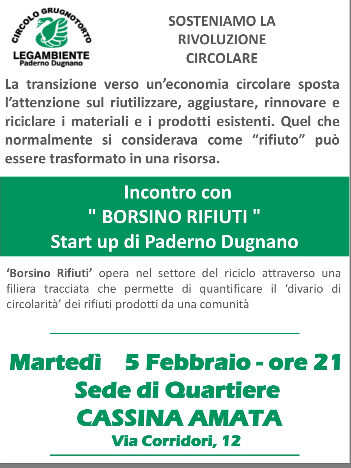 Anche in vista di #eclabollate, il prossimo incontro pubblico del 26 febbraio, organizzato del Circolo Legambiente di Bollate, presso la biblioteca comunale e dedicato alle tante potenzialità dell’economia circolare , segnaliamo questo incontro organizzato dal circolo Grugnotorto di Paderno Dugnano.