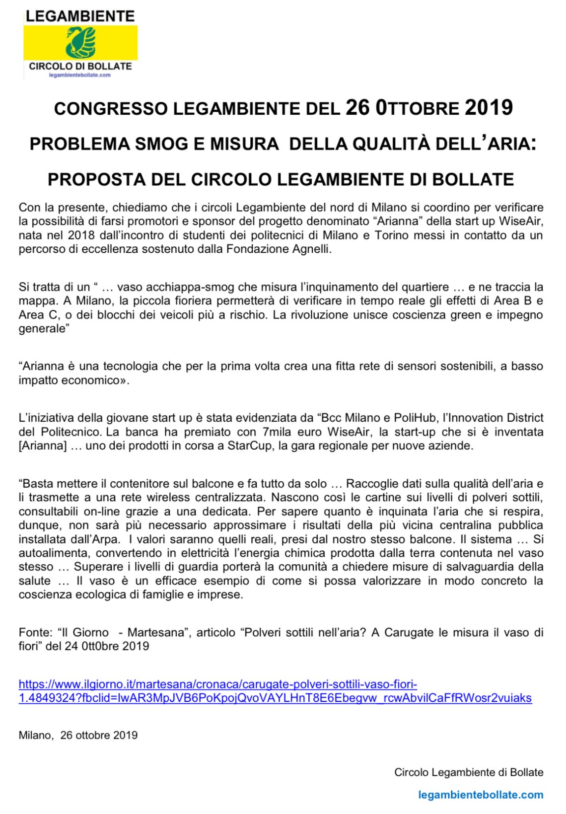 Con la presente, chiediamo che i circoli Legambiente del nord di Milano si coordino per verificare la possibilità di farsi promotori e sponsor del progetto denominato “Arianna” della start up WiseAir, nata nel 2018 dall’incontro di studenti dei politecnici di Milano e Torino messi in contatto da un percorso di eccellenza sostenuto dalla Fondazione Agnelli.