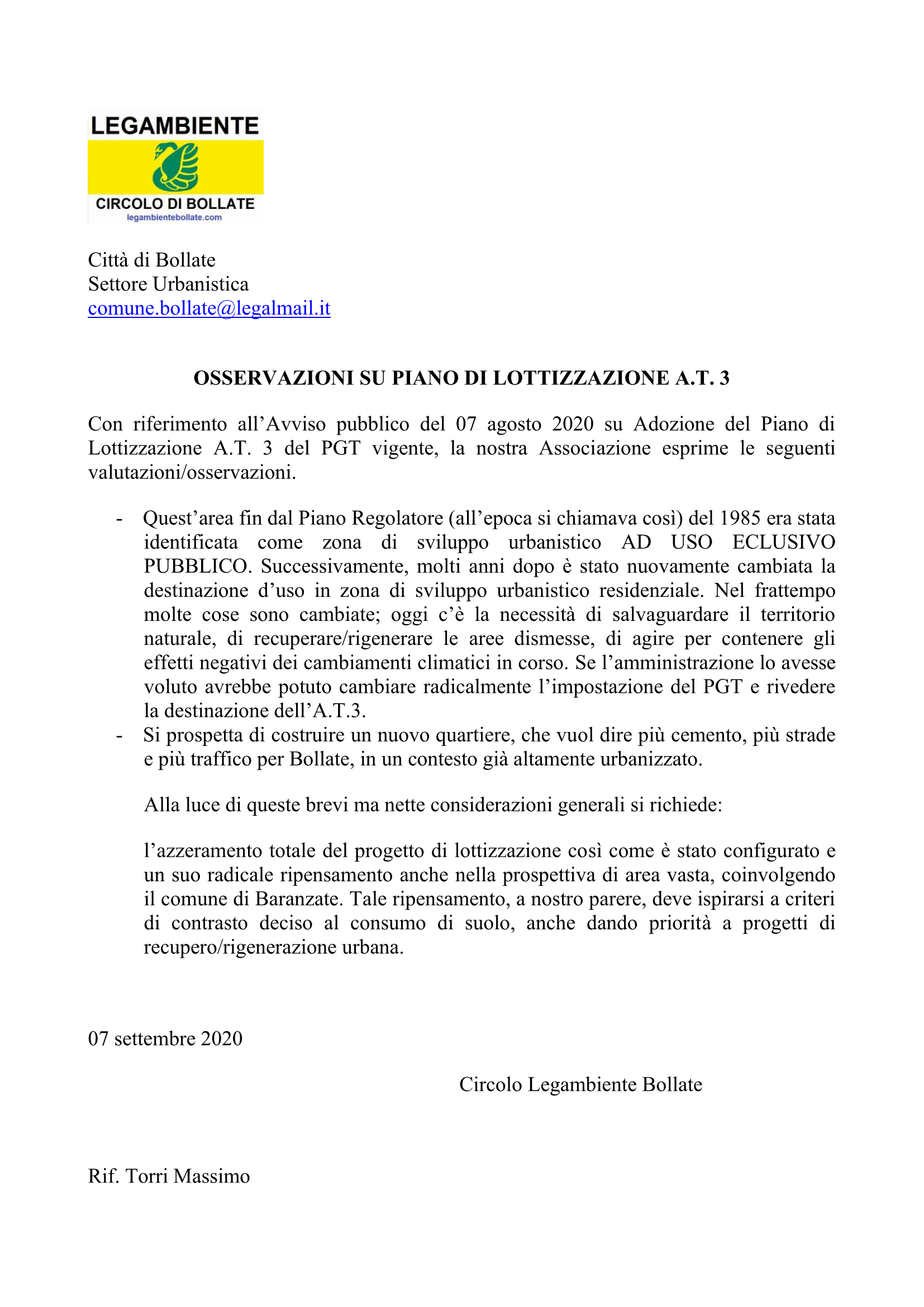 Dando seguito al comunicato del 1 settembre 2020, il circolo bollatese ha presentato le proprie osservazioni nel merito del piano di lottizzazione A.T. n. 3