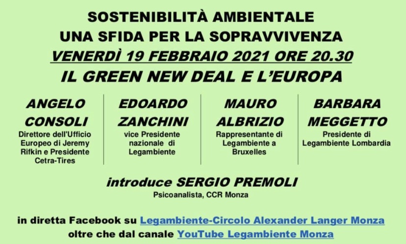 Il circolo di Monza sta organizzando una diretta fb e youtube sul tema del “green new deal”. L’evento si terrà questo venerdì 19 febbraio alle 20.30 in diretta fb e sul canale youtube del circolo …..ecco il link all’evento su fb https://www.facebook.com/events/173755617569931 buona giornata