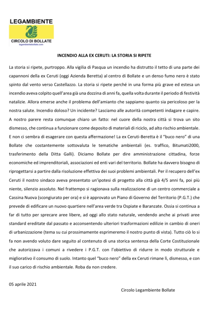 La storia si ripete, purtroppo. Alla vigilia di Pasqua un incendio ha distrutto il tetto di una parte dei capannoni della ex Ceruti (oggi Azienda Beretta) al centro di Bollate e un denso fumo nero è stato spinto dal vento verso Castellazzo. La storia si ripete perché in una forma più grave ed estesa un incendio aveva colpito quell’area già una dozzina di anni fa, quella volta durante il periodo di festività natalizie. Allora emerse anche il problema dell’amianto che sappiamo quanto sia pericoloso per la nostra salute. Incendio doloso? Un incidente? Lasciamo alle autorità competenti indagare e capire. A nostro parere resta comunque chiaro un fatto: nel cuore della nostra città si trova un sito dismesso, che continua a funzionare come deposito di materiali di riciclo, ad alto rischio ambientale. E non ci sembra di esagerare con questa affermazione! La ex Ceruti-Beretta è il “buco nero” di una Bollate che costantemente sottovaluta le tematiche ambientali (es. traffico, Bitumati2000, trasferimento della Ditta Galli). Diciamo Bollate per dire amministrazione cittadina, forze economiche ed imprenditoriali, associazioni ed enti vari del territorio. Bollate ha davvero bisogno di riprogettarsi a partire dalla risoluzione effettiva dei suoi problemi ambientali. Per il recupero dell’ex Ceruti il nostro sindaco aveva presentato un’ipotesi di progetto alla città già 4/5 anni fa, poi più niente, silenzio assoluto. Nel frattempo si ragionava sulla realizzazione di un centro commerciale a Cassina Nuova (scongiurato per ora) e si è approvato un Piano di Governo del Territorio (P.G.T.) che prevede di edificare un nuovo quartiere nell’area verde tra Ospiate e Baranzate. Ossia si continua a far di tutto per sprecare aree libere, ad oggi allo stato naturale, vendendo anche ai privati aree standard ereditate dal passato e acconsentendo ulteriori trasformazioni edilizie in cambio di oneri di urbanizzazione (tema su cui prossimamente esprimeremo il nostro punto di vista). Tutto ciò lo si fa non avendo voluto dare seguito al contenuto di una storica sentenza della Corte Costituzionale che autorizzava i comuni a rivedere i P.G.T. con l’obiettivo di ridurre in modo strutturale e migliorativo il consumo di suolo. Intanto quel “buco nero” della ex Ceruti rimane lì, dismesso, e con il suo carico di rischio ambientale. Roba da non credere.