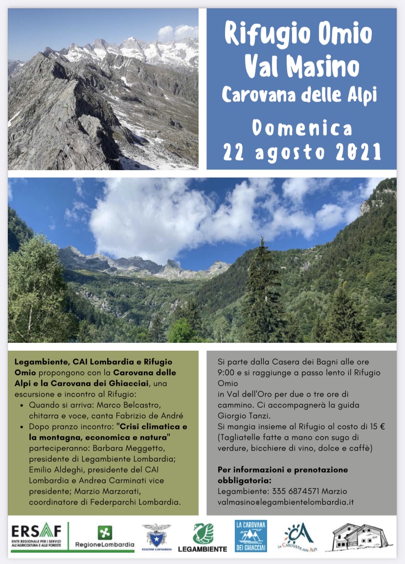 Domenica, 22 agosto 2021, si realizzerà in Val Masino una bellissima escursione al Rifugio Omio. L’iniziativa è organizzata all’interno della Carovana delle Alpi e prevede la passeggiata, un concerto davanti al Rifugio e un incontro per discutere di montagna, biodiversità, Natura2000 ed economica. Una bella occasione per parlare del cuore delle Alpi.