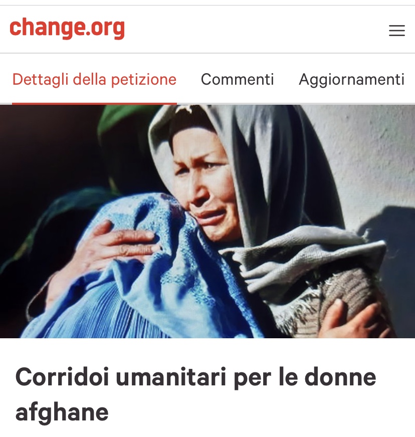 Corridoi umanitari per le donne e bambini afghani R117 agosto 202117 agosto 2021Bollate Navigazione articoli PrecedenteContinua Firmate la petizione , non c’è più tempo da perdere! https://www.change.org/p/ministero-esteri-corridoi-umanitari-per-le-donne-afghane?utm_content=cl_sharecopy_30351679_it-IT%3A0&recruited_by_id=9ecd58f0-ff26-11eb-85a2-d121afc43e7e&utm_source=share_petition&utm_medium=copylink&utm_campaign=psf_combo_share_initial&utm_term=psf_combo_share_initial Condividi: Condividi su X (Si apre in una nuova finestra) X Condividi su Facebook (Si apre in una nuova finestra) Facebook Email a link to a friend (Si apre in una nuova finestra) E-mail Stampa (Si apre in una nuova finestra) Stampa Condividi su WhatsApp (Si apre in una nuova finestra) WhatsApp Condividi su Telegram (Si apre in una nuova finestra) Telegram Condividi su Tumblr (Si apre in una nuova finestra) Tumblr Mi piace Caricamento...