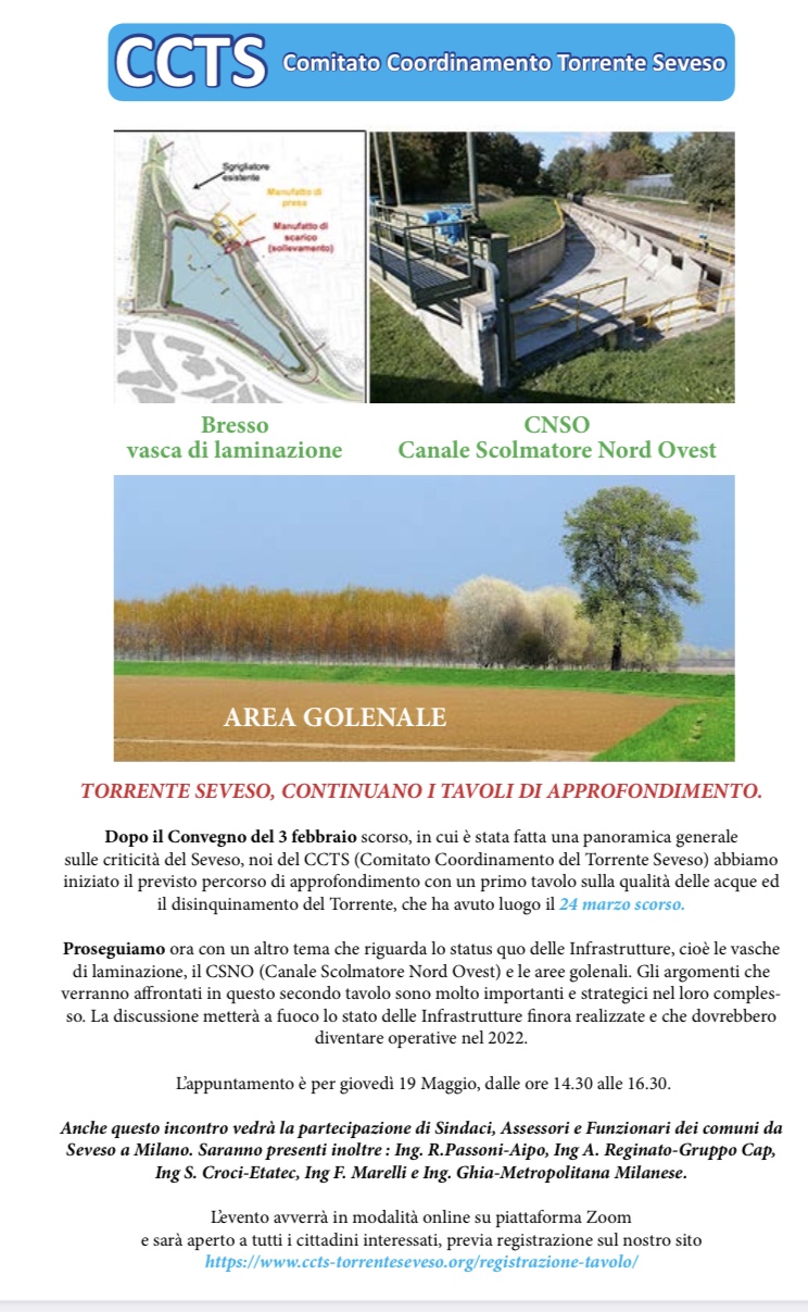sulle criticità del Seveso, noi del CCTS (Comitato Coordinamento del Torrente Seveso) abbiamo iniziato il previsto percorso di approfondimento con un primo tavolo sulla qualità delle acque ed il disinquinamento del Torrente, che ha avuto luogo il 24 marzo scorso.