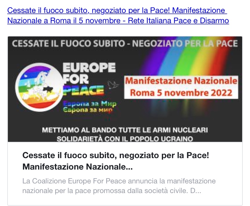 Cessate il fuoco subito, negoziato per la Pace! R121 ottobre 2022Bollate Navigazione articoli PrecedenteContinua Fonte : https://retepacedisarmo.org/2022/cessate-il-fuoco-subito-negoziato-per-la-pace-manifestazione-nazionale-a-roma-il-5-novembre/ Condividi: Condividi su X (Si apre in una nuova finestra) X Condividi su Facebook (Si apre in una nuova finestra) Facebook Email a link to a friend (Si apre in una nuova finestra) E-mail Stampa (Si apre in una nuova finestra) Stampa Condividi su WhatsApp (Si apre in una nuova finestra) WhatsApp Condividi su Telegram (Si apre in una nuova finestra) Telegram Condividi su Tumblr (Si apre in una nuova finestra) Tumblr Mi piace Caricamento...