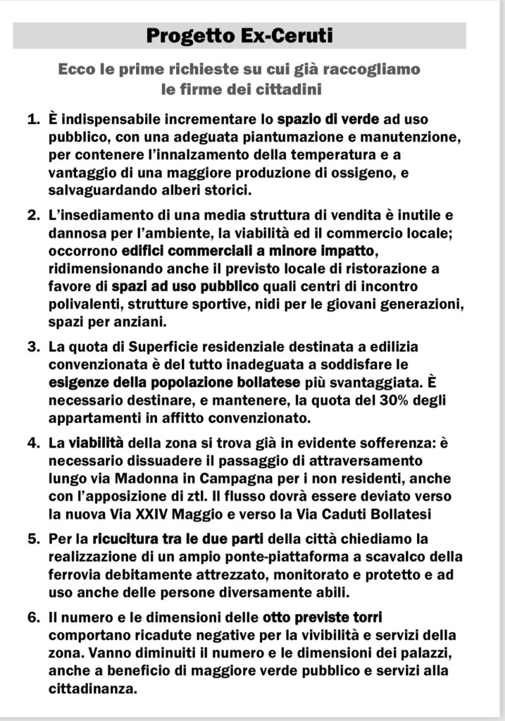 Il numero e le dimensioni delle otto previste torri comportano ricadute negative per la vivibilità e servizi della zona. Vanno diminuiti il numero e le dimensioni dei palazzi, anche a beneficio di maggiore verde pubblico e servizi alla cittadinanza.