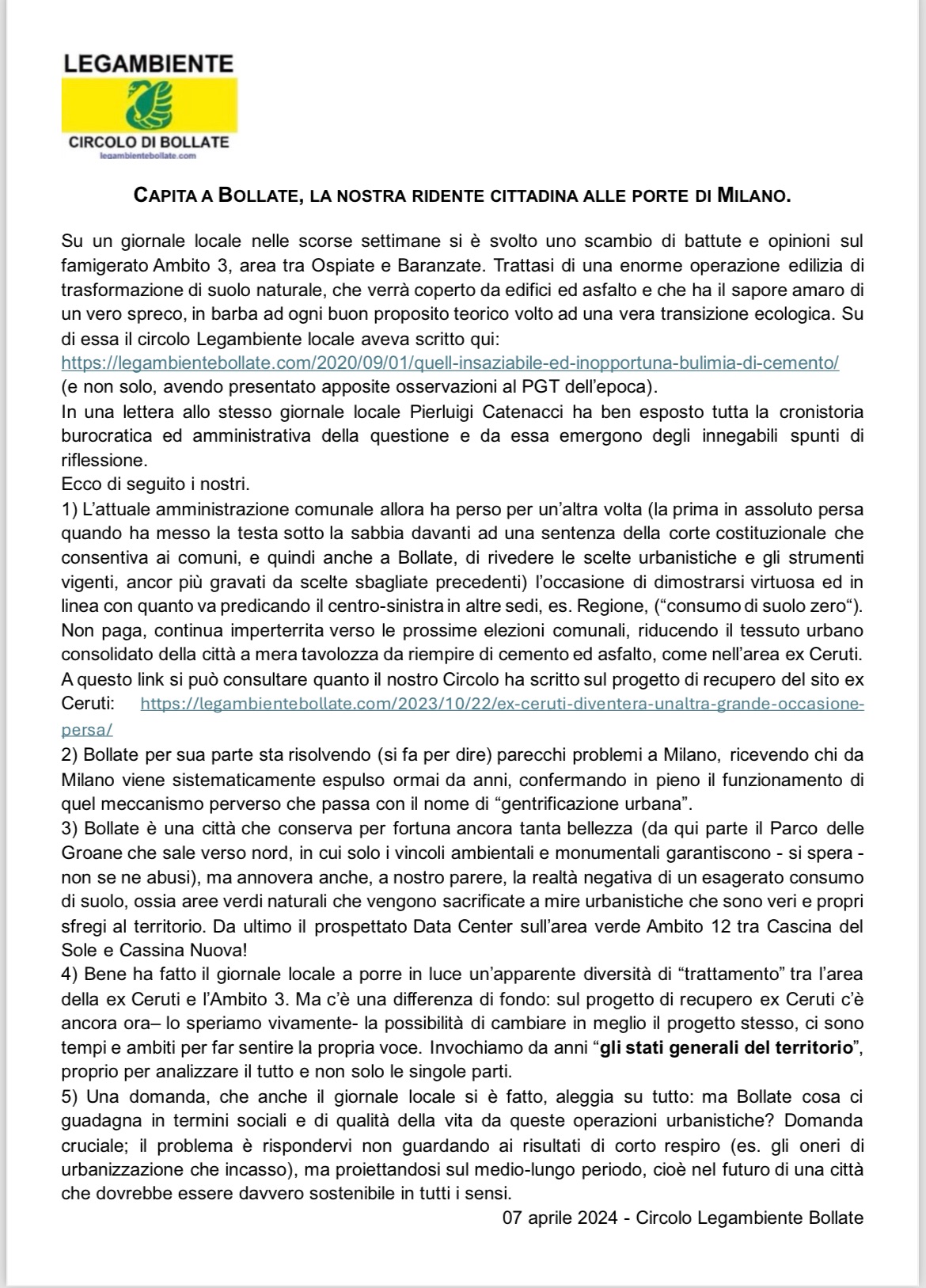 3) Bollate è una città che conserva per fortuna ancora tanta bellezza (da qui parte il Parco delle Groane che sale verso nord, in cui solo i vincoli ambientali e monumentali garantiscono – si spera – non se ne abusi), ma annovera anche, a nostro parere, la realtà negativa di un esagerato consumo di suolo, ossia aree verdi naturali che vengono sacrificate a mire urbanistiche che sono veri e propri sfregi al territorio. Da ultimo il prospettato Data Center sull’area verde Ambito 12 tra Cascina del Sole e Cassina Nuova!