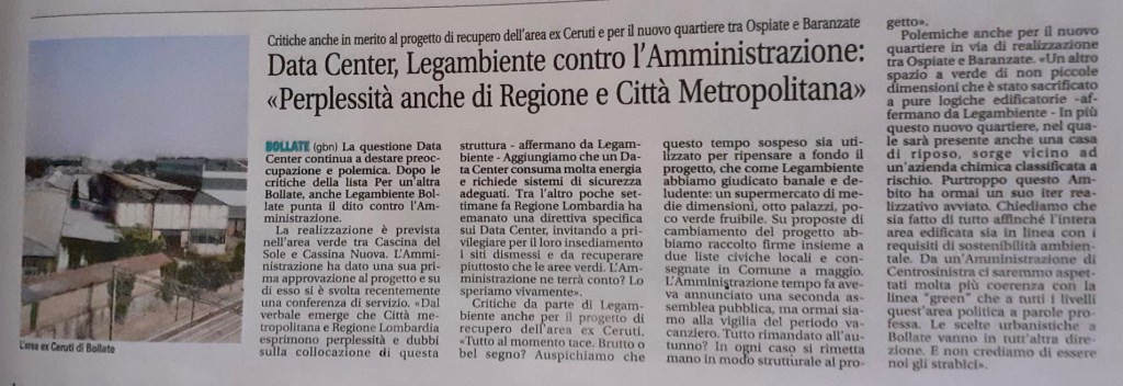 1) La realizzazione di un DATA CENTER di una certa dimensione nell’area verde tra Cascina del Sole e Cassina Nuova (Ambito 12) a ridosso dell’A52, là dove qualche anno fa si voleva costruire un centro commerciale. L’Amministrazione cittadina ha dato una sua prima approvazione al progetto e su di esso si è svolta recentemente una conferenza di servizio. Dal verbale di tale conferenza emerge che Città metropolitana e Regione Lombardia esprimono perlomeno perplessità e dubbi sulla collocazione di questa struttura su suolo libero e adiacente ad un importante corridoio ecologico previsto nei piani metropolitani. Aggiungiamo che un DATA CENTER consuma molta energia e richiede sistemi di sicurezza adeguati. Tra l’altro poche settimane fa Regione Lombardia ha emanato una direttiva specifica sui DATA CENTER, invitando a privilegiarle per il loro insediamento i siti dismessi e da recuperare piuttosto che le aree verdi.