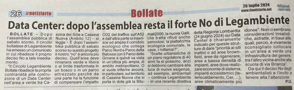 Il Circolo Legambiente Bollate ribadisce la propria contrarietà alla costruzione di un DATA CENTER nell’area a verde tra Cascina del Sole e Cassina Nuova (Ambito 12). E dopo l’assemblea pubblica di sabato scorso su questo progetto il nostro “no” è ancora più deciso. Quell’area deve rimanere verde e libera o al limite trasformata in un bosco o in un parco attrezzato perché da una parte ha la funzione di compensare l’impatto CO2 del traffico sull’A52 e dall’altra parte si inserisce ed amplia il corridoio ecologico che collega Parco Nord e Parco della Balossa con il Parco delle Groane e quindi va vista in un’ottica più ampia, di ambito metropolitano.