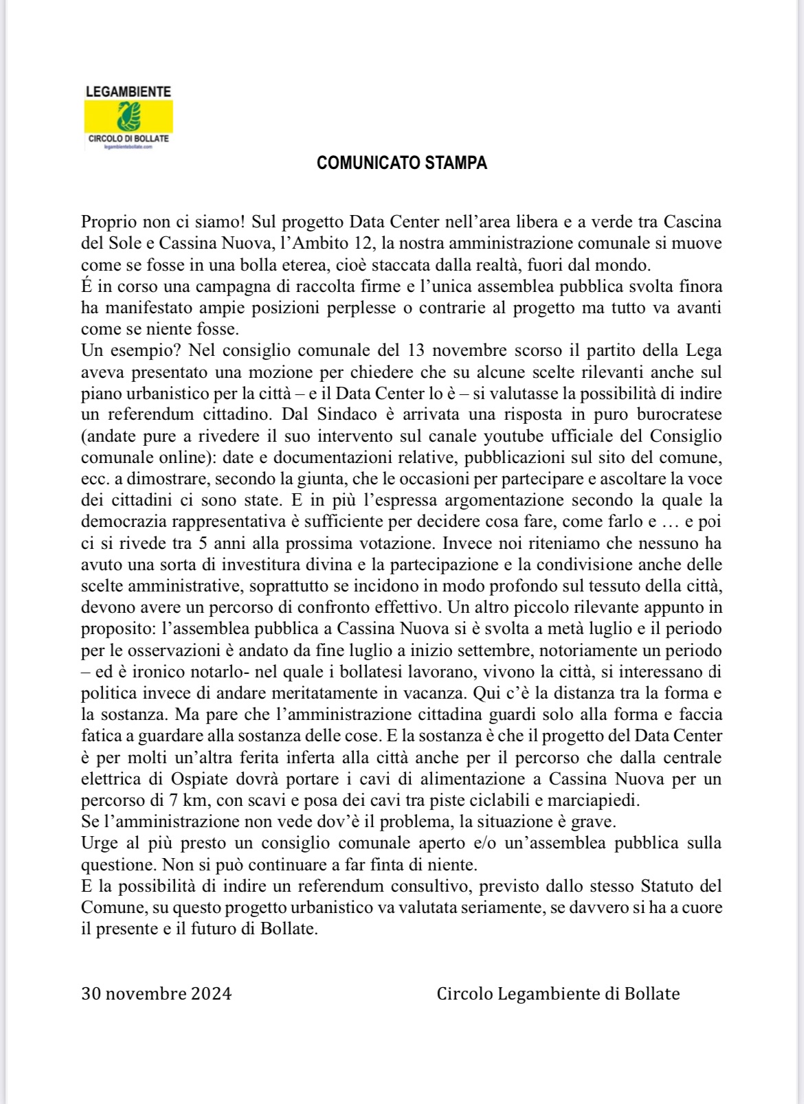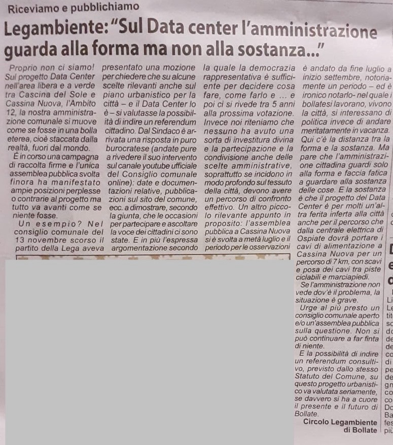 Proprio non ci siamo! Sul progetto Data Center nell’area libera e a verde tra Cascina