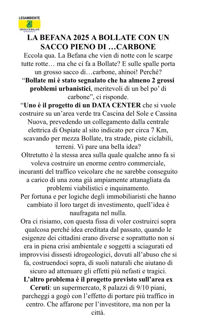 “Uno è il progetto di un DATA CENTER che si vuole costruire su un’area verde tra Cascina del Sole e Cassina Nuova, prevedendo un collegamento dalla centrale elettrica di Ospiate al sito indicato per circa 7 Km, scavando per mezza Bollate, tra strade, piste ciclabili, terreni. Vi pare una bella idea?