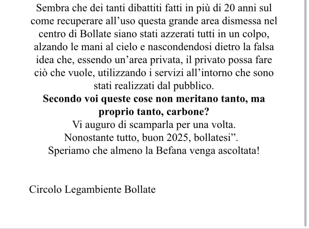 “Bollate mi è stato segnalato che ha almeno 2 grossi problemi urbanistici, meritevoli di un bel po’ di carbone”, ci risponde.