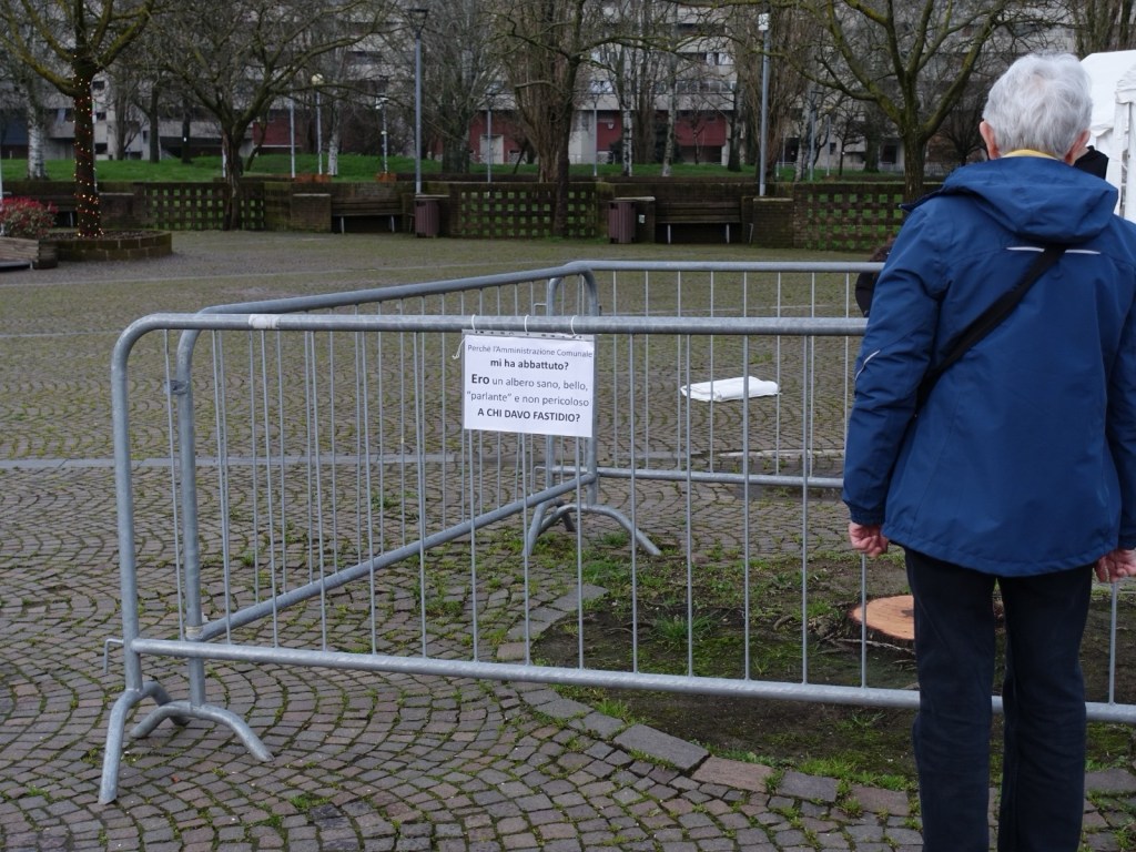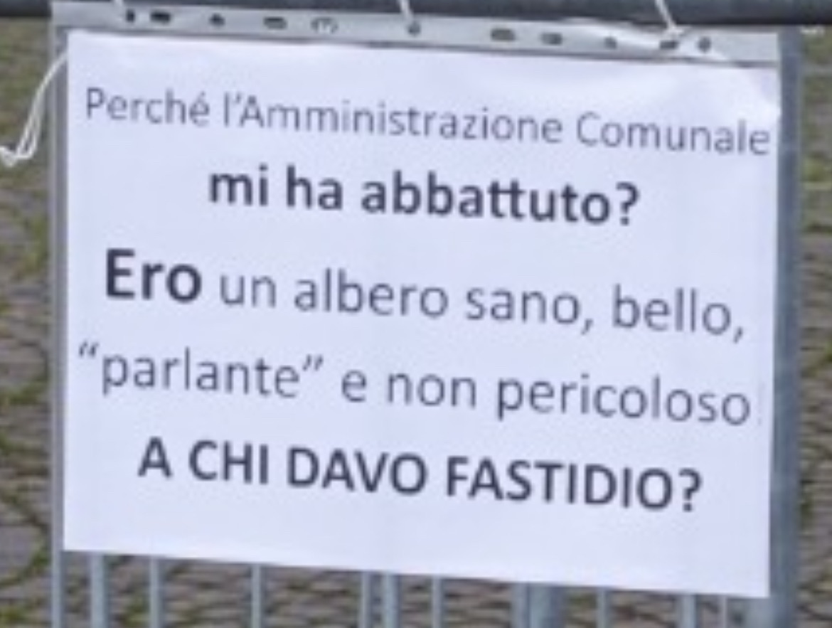 PROTESTANO per l’abbattimento di due alberi di una certa consistenza per motivi, è stato comunicato, di sicurezza. Ma davvero non c’erano alternative? A Bollate c’è da un po’ di tempo l’andazzo di abbattere, sradicare. Bollate ha bisogno di più verde non di meno. Sul cartello è scritto:
