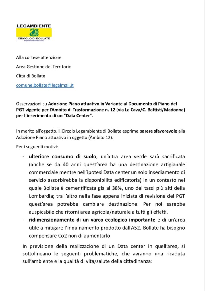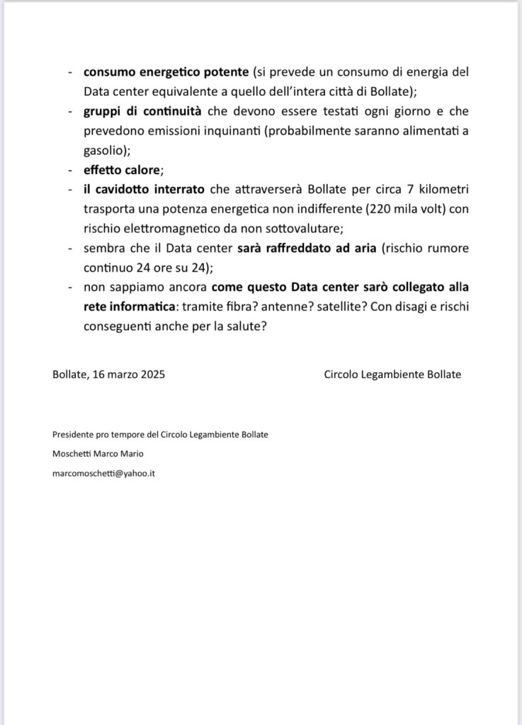 In previsione della realizzazione di un Data center in quell’area, si sottolineano le seguenti problematiche, che avranno una ricaduta sull’ambiente e la qualità di vita/salute della cittadinanza:- consumo energetico potente (si prevede un consumo di energia del Data center equivalente a quello dell’intera città di Bollate);