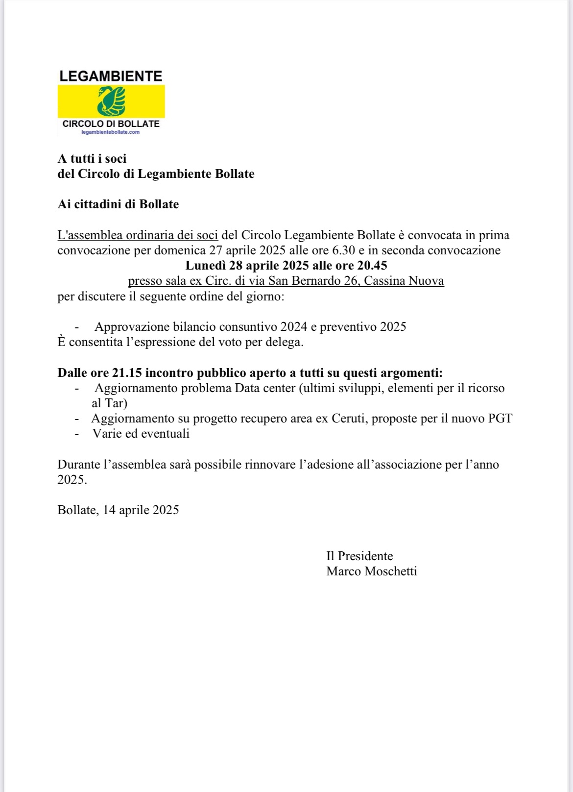L’assemblea ordinaria dei soci del Circolo Legambiente Bollate è convocata in prima convocazione per domenica 27 aprile 2025 alle ore 6.30 e in seconda convocazione Lunedì 28 aprile 2025 alle ore 20.45 presso sala ex Circ. di via San Bernardo 26, Cassina Nuova per discutere il seguente ordine del giorno: