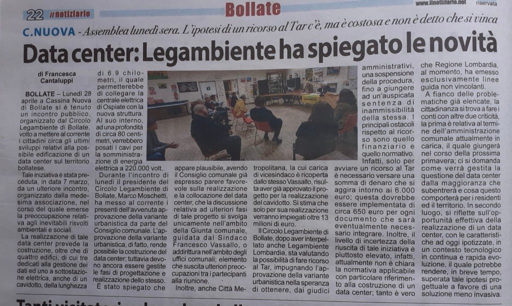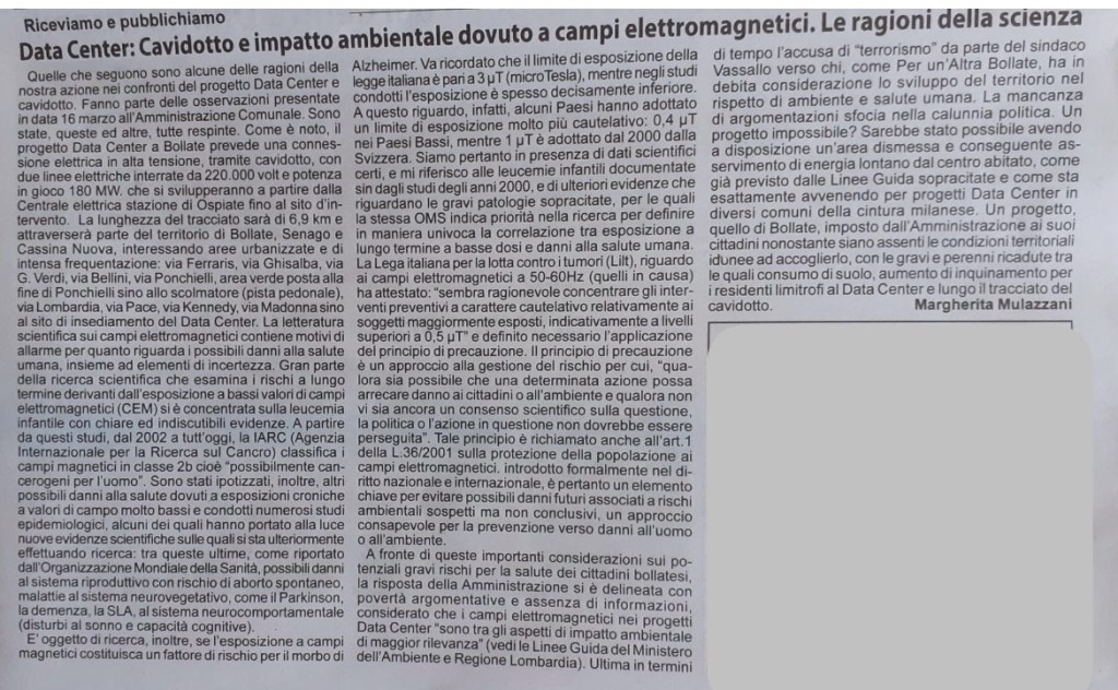 Pubblichiamo il resoconto de “ Il notiziario” sulla serata di lunedì 28 aprile scorso – il giornale , con altre importanti notizie lo trovate in edicola – e un altro contributo molto articolato di una cittadina bollatese, ripreso sempre dalla stessa testata giornalistica locale.