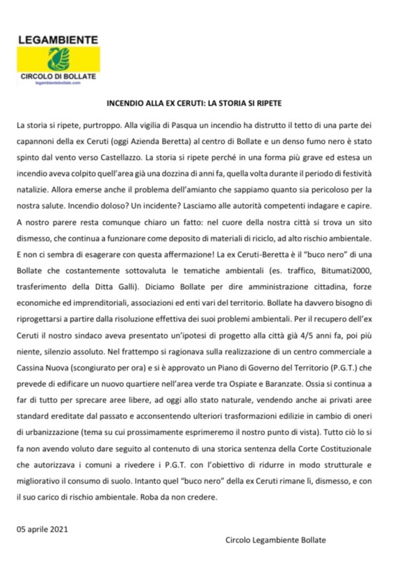 Osservazioni del circolo legambiente di Bollate al progetto di rigenerazione urbana sull’area ex Ceruti