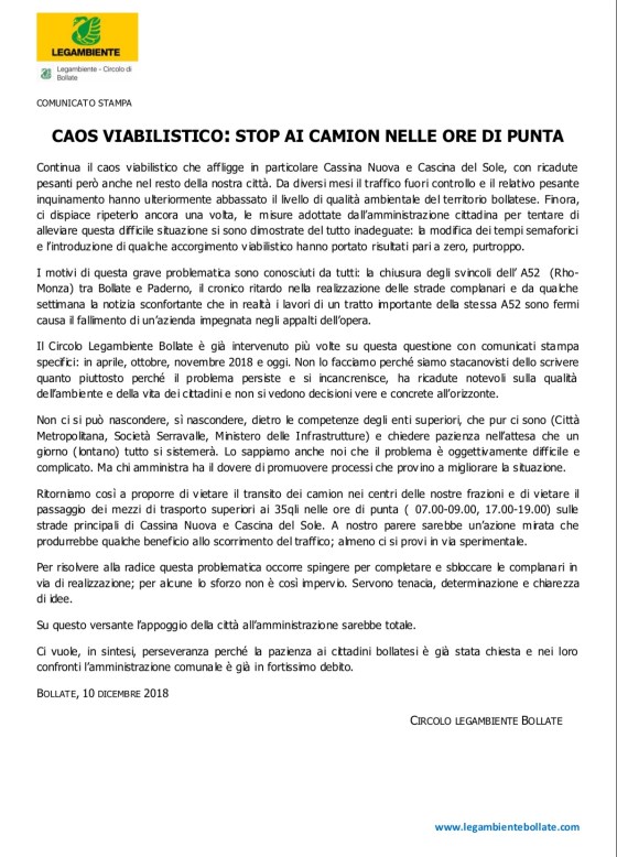 Di seguito, il comunicato stampa diramato dopo il presidio effettuato in data 12.12.2018 dal circolo bollatese di Legambiente, presso la rotonda di via … Altro