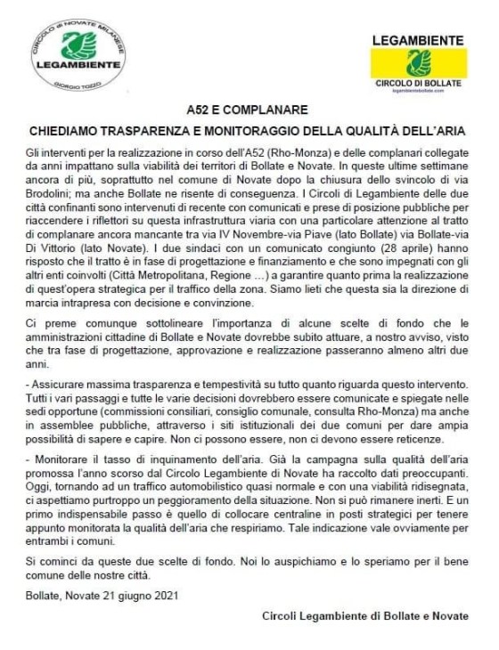 Comunicato stampacongiunto A52 E COMPLANARECHIEDIAMO TRASPARENZA E MONITORAGGIO DELLA QUALITÀ DELL’ARIAGli interventi per la realizzazione in corso dell’A52 (Rho-Monza) e … Altro